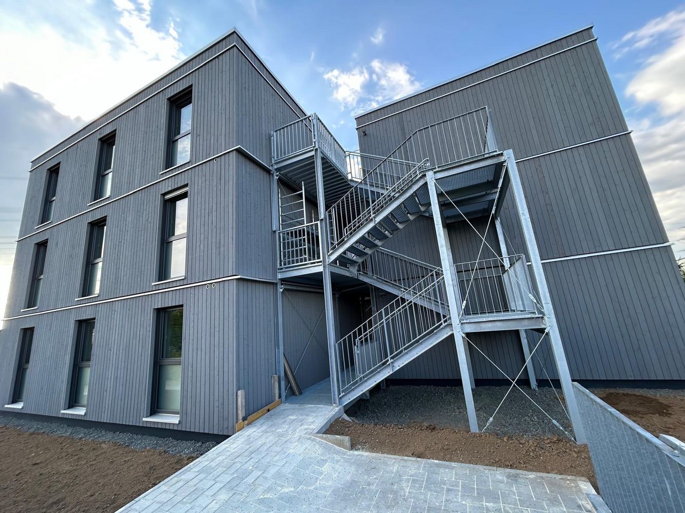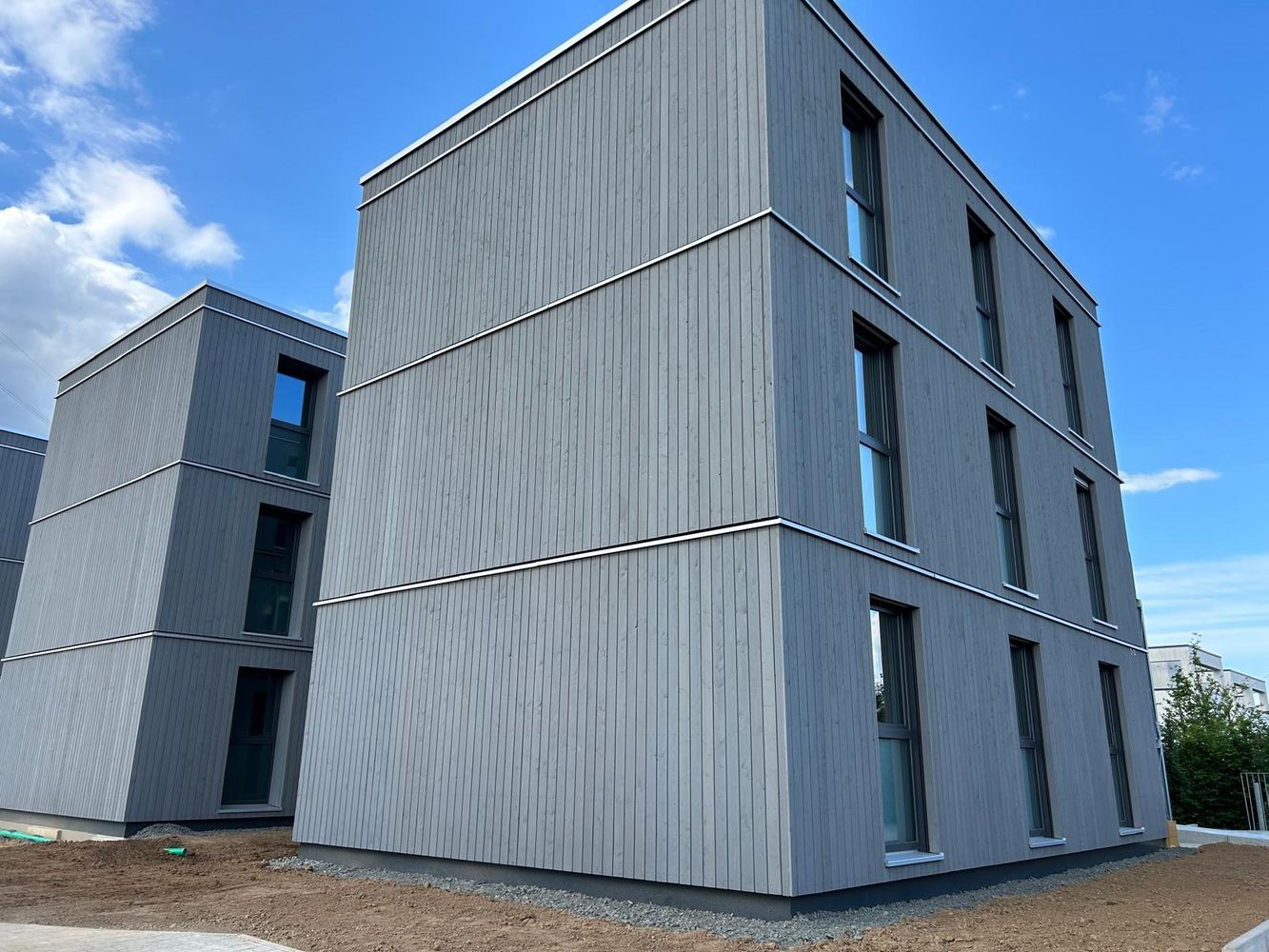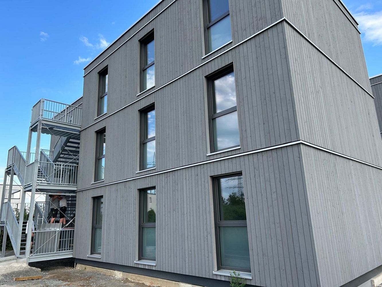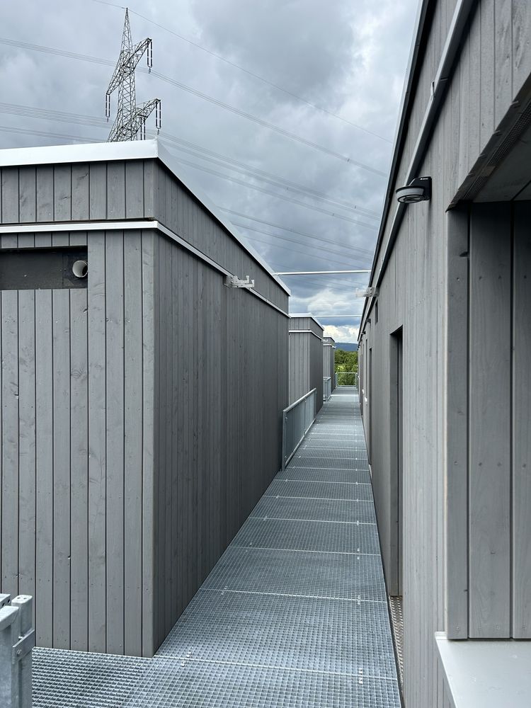 Insgesamt wurden 69 Module verbaut, verteilt auf 23 Module pro Geschoss. Die Außenwände der Module sind als gedämmte Holzrahmenwände mit 24er Ständerwerk ausgeführt. Die Fassade wurde als vorgehängt-hinterlüftete Konstruktion mit einer vertikalen Verschalung aus vorvergrauten Lärche-Falzprofilen realisiert. Die gesamte Außenwandkonstruktion ist feuerhemmend ausgeführt. Damit verbindet das Projekt die Vorteile des Holzbaus mit den Anforderungen an Robustheit, Sicherheit und eine dauerhaft stimmige Gestaltung.